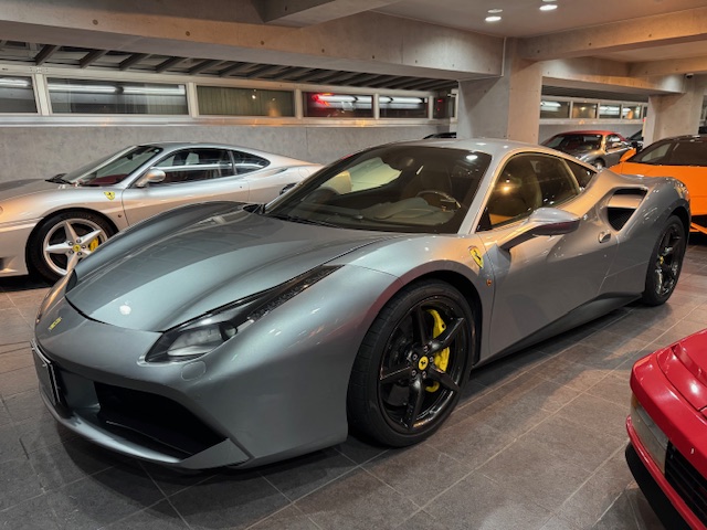 平成28年(2016年)フェラーリ 488GTB ディーラー車 無事故 グリジオチタニオメタリック LED付きカーボンファイバー製ドライバーゾーン プライス 24200000円(税込み)